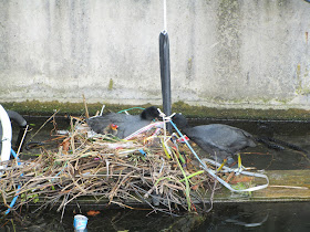 En in Leiden stond een groep mensen bij een brug foto's te maken van een koetenpaar bij hun nest, waar zowel eieren als jongen in lagen. Het mannetje zwom driftig af en aan en offreerde zijn vrouwtje takjes, linten en andersoortig nestelmateriaal. Op zeker moment ging mevrouw te water om een ommetje te maken, haar man vleidde zich even later op het nest. Een erg leuk gezicht, die zorgzame diertjes.